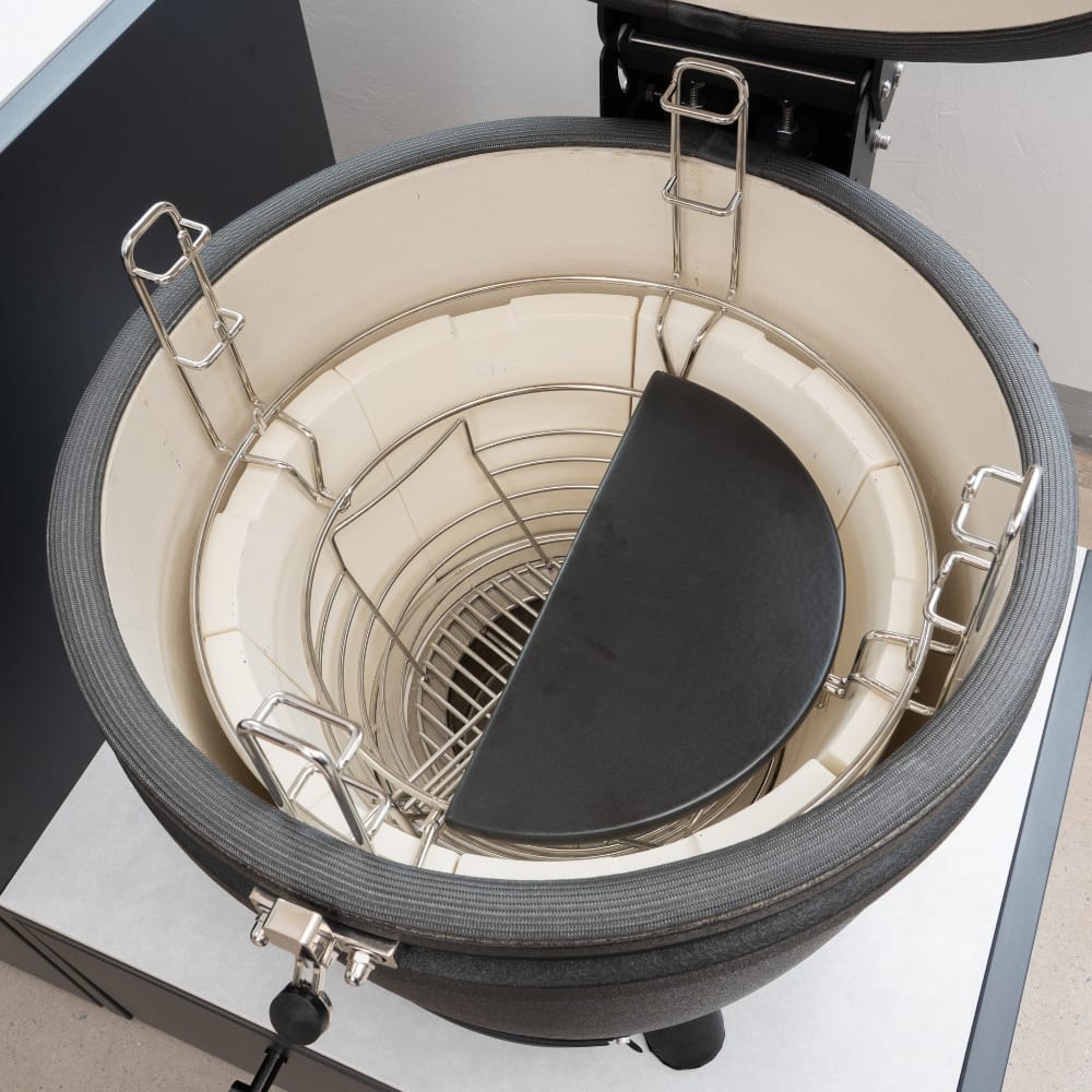 La cámara de combustión de cerámica de cordierita del Bison Kamado 23 garantiza una resistencia extrema al calor y una estabilidad térmica constante, clave para ahumados largos y cocciones lentas. En un horno kamado, este tipo de material resulta fundamental para mantener el calor de forma homogénea durante horas.