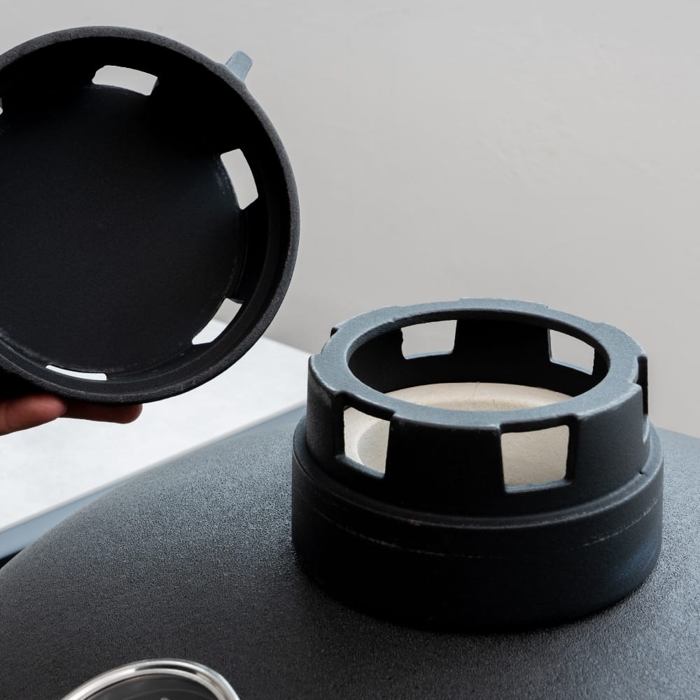 El tiro superior de hierro fundido del Bison Kamado 23 mejora la regulación del flujo de aire y aporta robustez, incluso en usos intensivos. En un horno kamado, este componente contribuye directamente a un control más fino del calor y del comportamiento del fuego.