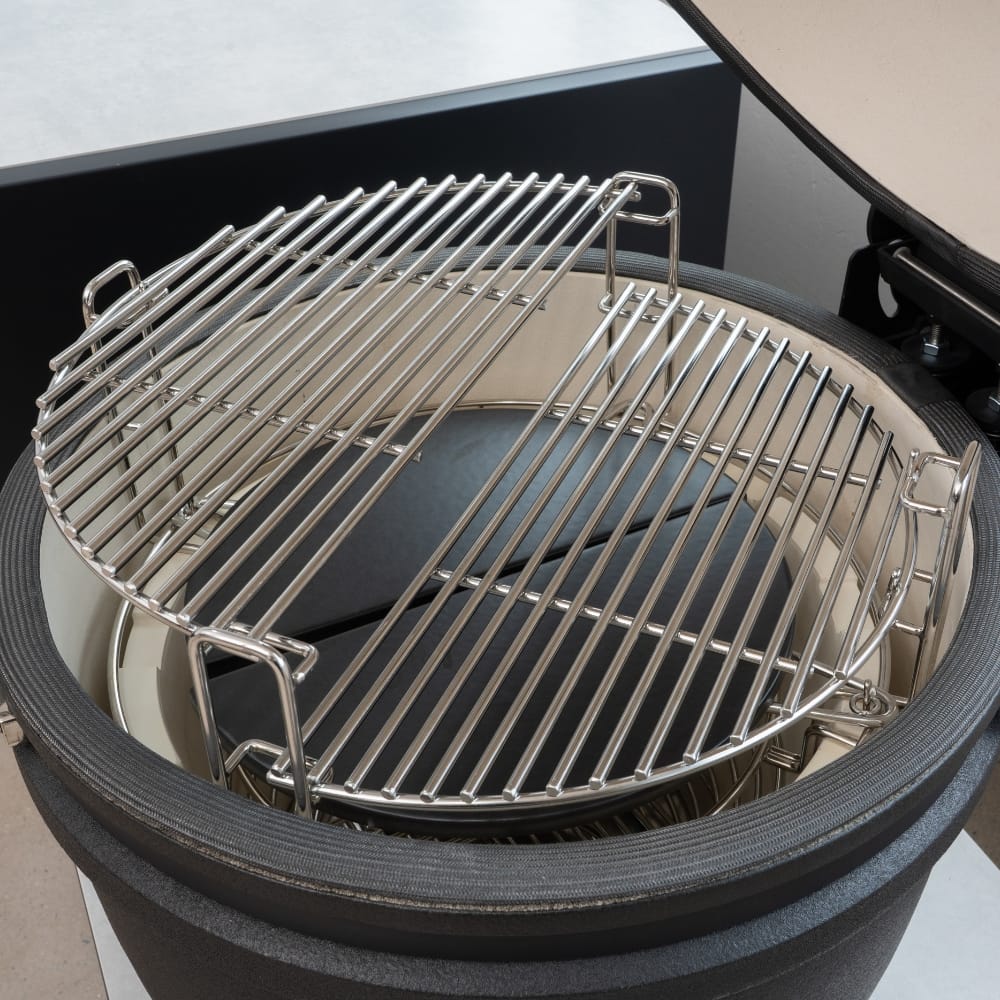 La rejilla de cocción de acero inoxidable 304, con un grosor de 7,0 mm, distribuye el calor de forma homogénea y soporta altas temperaturas sin deformarse. Este detalle refuerza el rendimiento del horno kamado cuando se cocina con intensidad o durante sesiones prolongadas.